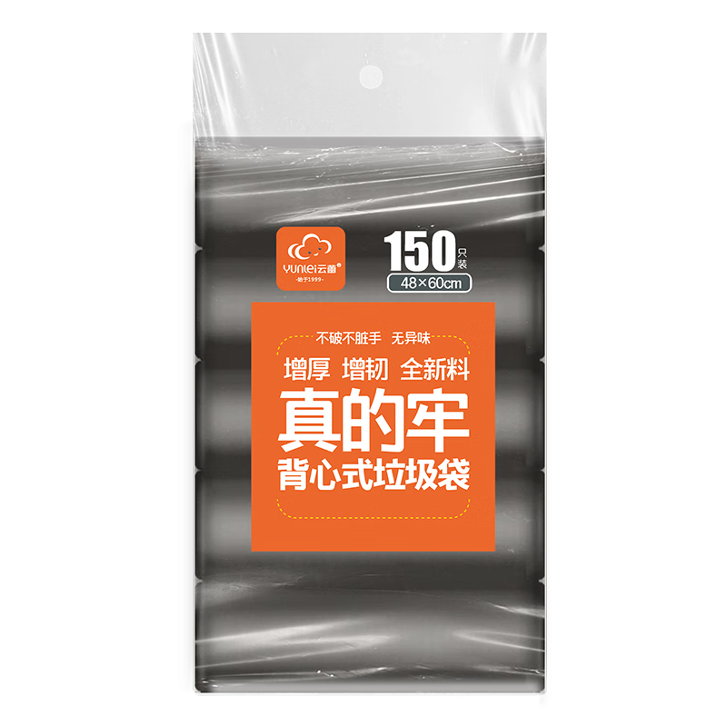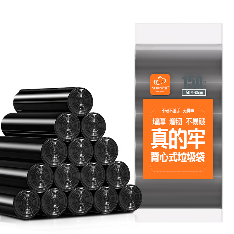 云蕾背心垃圾袋,黑色50*60cm 150只装,现价仅售11.8元。单面1丝材质,薄而坚韧,适用于各种垃圾桶和家庭使用场景,方便收纳、易于打包。