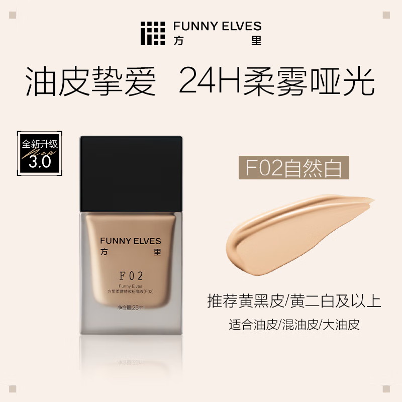方里(FUNNY ELVES)F02持妆粉底液专为油性肌肤设计,控油、持久服帖,现在仅售148元。