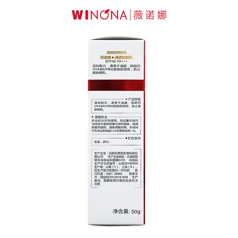 薇诺娜林高远同款清透防晒乳,采用SPF48 PA+的高效防护,轻薄质地易于涂抹且吸收快速,为肌肤提供全天候的紫外线保护。这款50g装的防晒霜不仅能够有效隔离有害紫外线对皮肤造成伤害,还具有保湿效果,适合各种肤质使用。