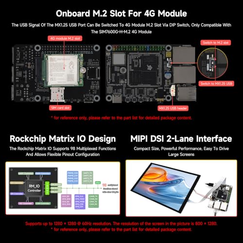 - Interfaces: MIPI DSI, dual Ethernet ports, USB, SDIO, RMII, M.2 slot for 4G module (module not included)