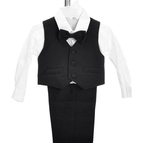 - Formal Styling: Classic black ensemble with white dress shirt and adjustable bowtie.