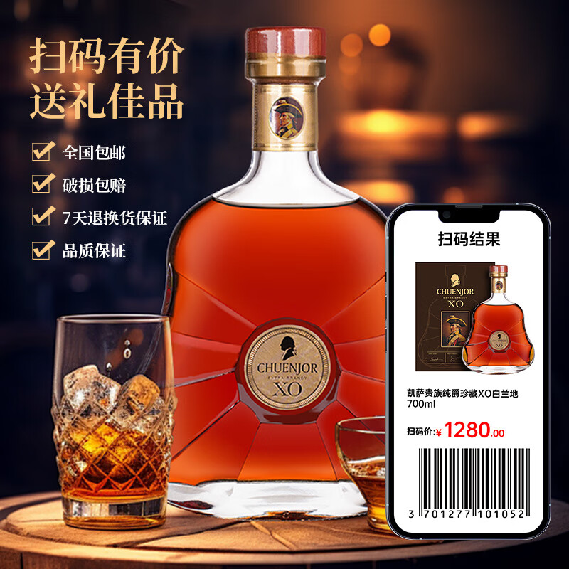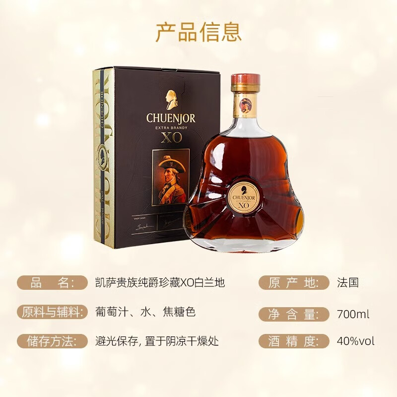 凯萨贵族白兰地XO洋酒,法国进口纯爵珍藏礼盒装,每瓶容量为700ml。这款洋酒具有经典的法国风味和优雅的包装设计,在各种庆祝场合中都显得格外特别。