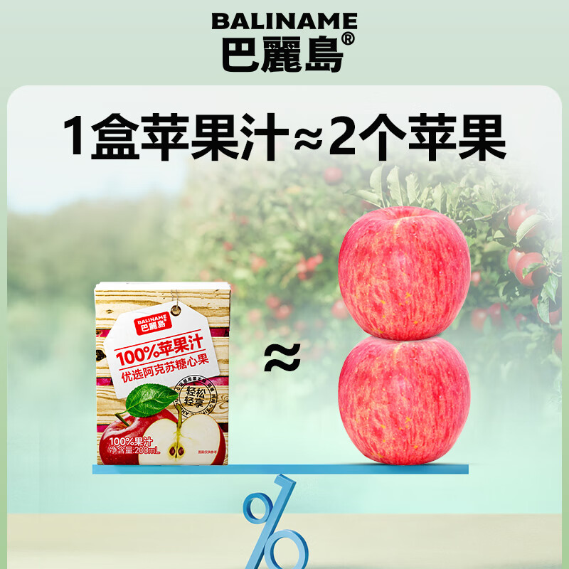 巴麗岛100%苹果汁,每一口都是纯天然的美味。这款苹果汁采用精选优质苹果为原料,无任何添加物,保留了天然水果的新鲜和营养。每瓶200ml容量,一箱共有12盒,非常适合家庭或办公室日常饮用。
