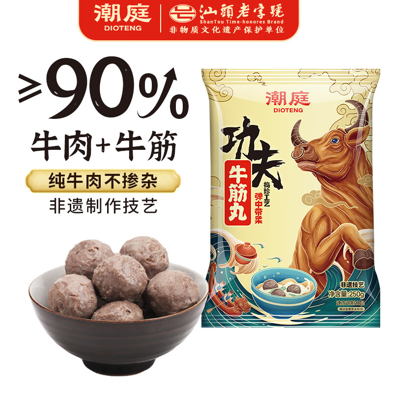 潮庭 潮汕功夫牛筋丸250g,90%牛肉和牛筋含量,好评如潮。现优惠价仅售43.7元。
