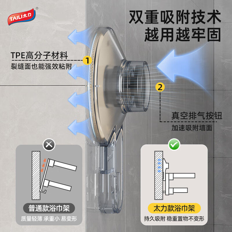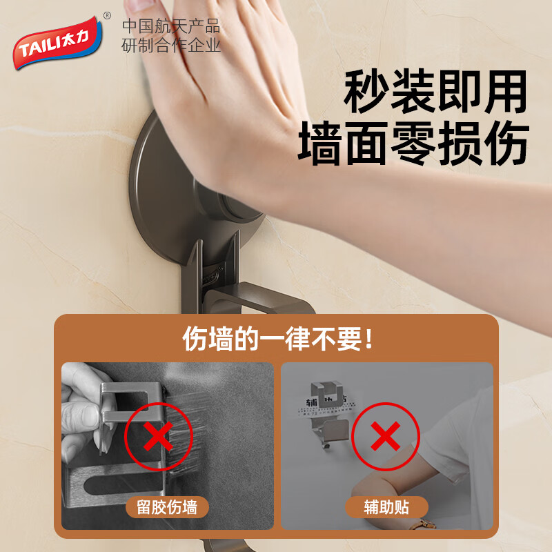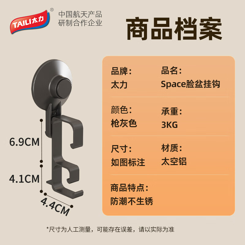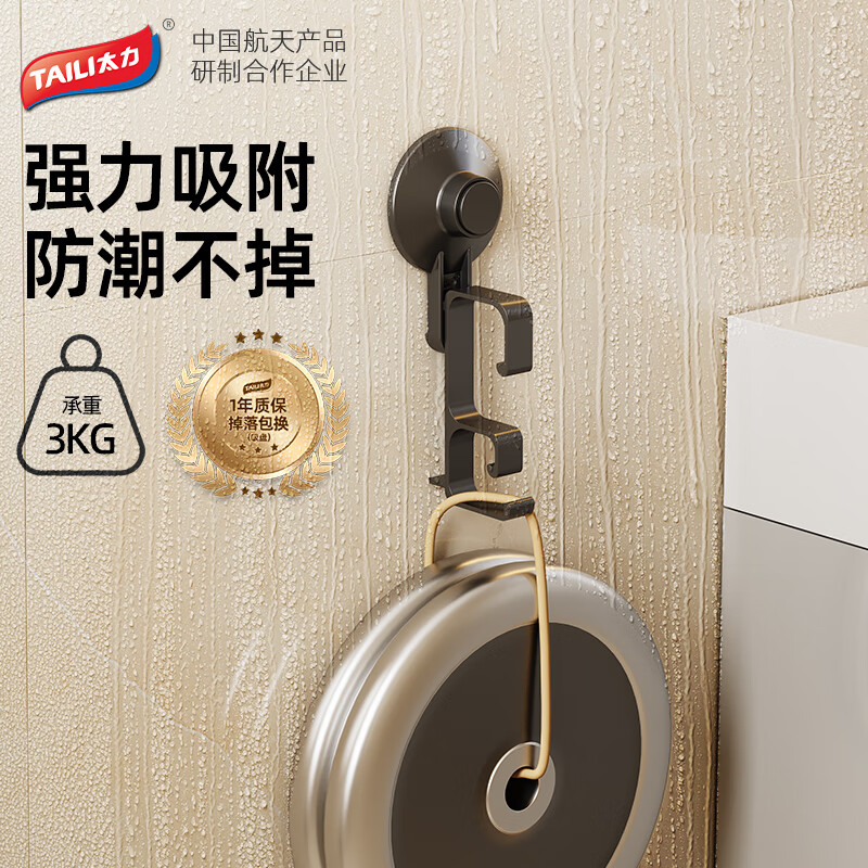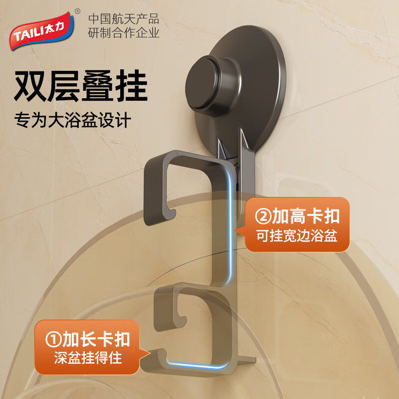 太力脸盆挂钩置物架吸盘挂钩免打孔挂盆神器,是您卫生间收纳的理想选择。该产品采用太空铝材质制作,不仅耐用而且美观。一个小小的装置可以承载多种物品的储放需求,帮助您的浴室空间实现最佳利用。