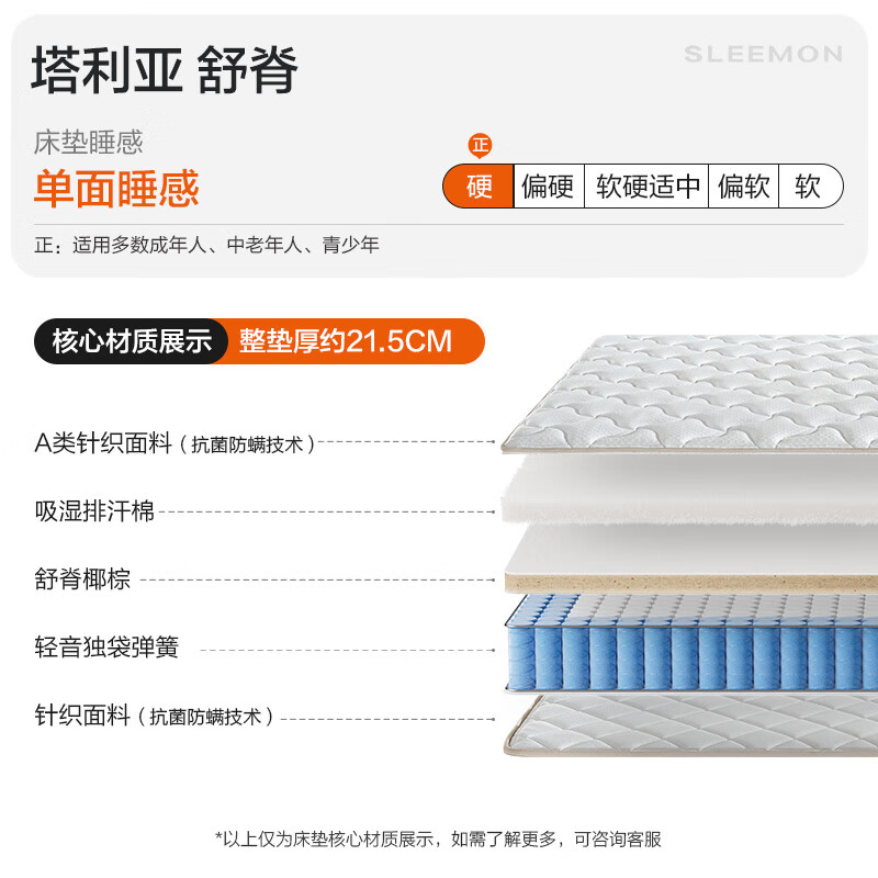 - 产品特性: 椰棕材质,抗菌防螨功能;独袋轻音弹簧,更舒适安静。