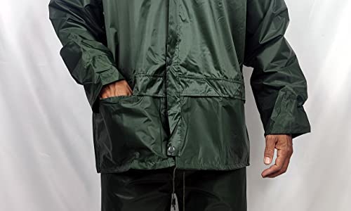- IMPERMEABLE: Fully waterproof suit with jacket and pants, featuring a zippered front closure, hood and covered pockets.