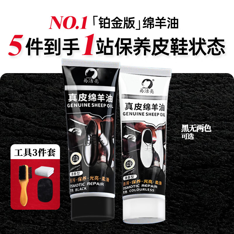 *易洁亮黑色皮鞋油护理套装保养油补色上光78克2支(黑色+无色+刷子毛巾),只需19.9元!立即拥有,让您的皮鞋焕发新生!