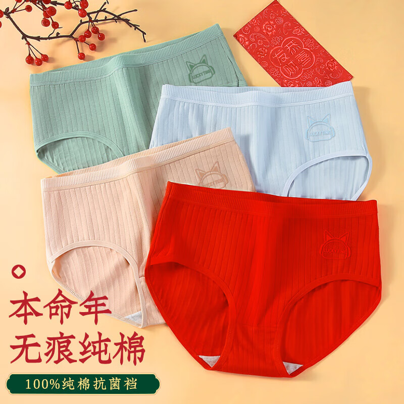 本命年大红色纯棉内裤女抗菌内裆舒适透气结婚喜庆鸿运三角裤大码 红+红,2条装,适合体重区间为130-155斤的消费者。