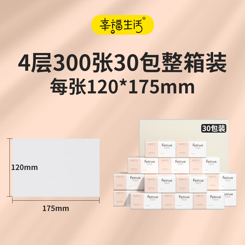 幸福生活纸巾抽纸,给你舒适与便捷的生活体验。这款纸巾是四层厚实设计,每包包含300张大容量纸巾,满足家庭日常使用需求。