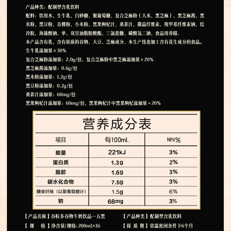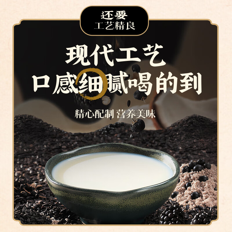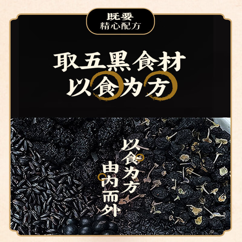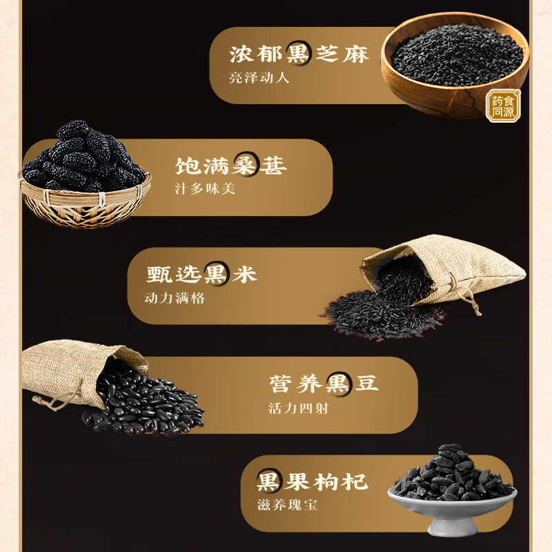 • 五黑配方: 黑豆、黑米、黑芝麻等营养成分的完美融合,既美味又健康;