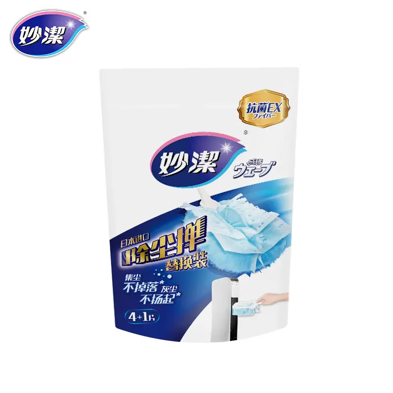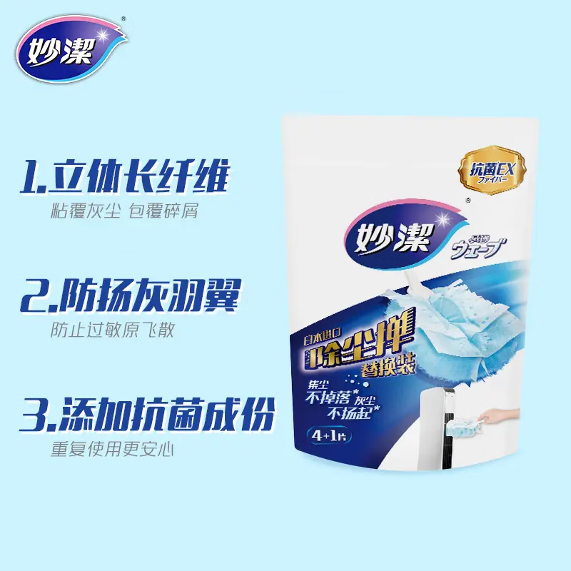 妙洁除尘掸采用静电技术,能够有效吸附灰尘,清洁效果显著。产品配有 5 支装替换装,便于使用和携带。