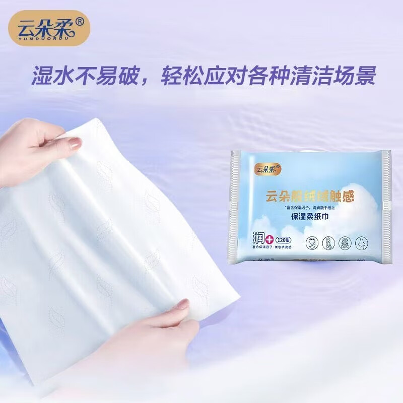 云朵柔3层40抽超韧乳霜纸,适合干湿两用。该款抽纸不仅具备超强韧性,即使敏感肌肤也能安心使用。