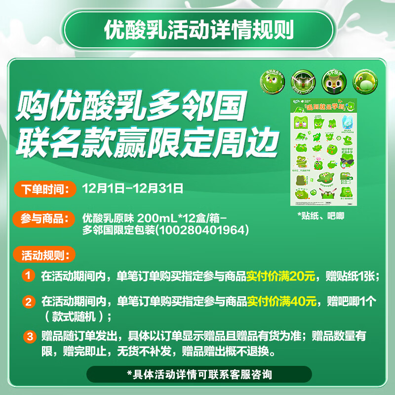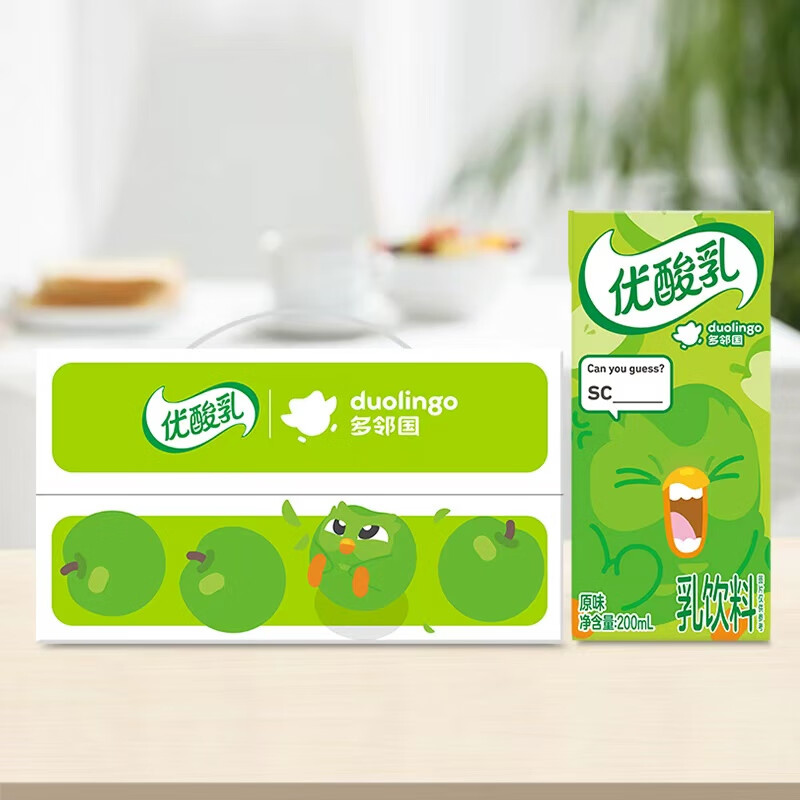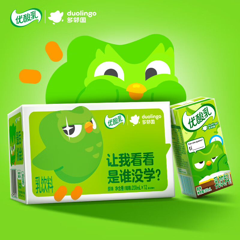 伊利优酸乳原味200ml*12盒/箱 牛奶饮品 多邻国限定包装,是一款深受广大消费者喜爱的牛奶饮品。此款优酸乳采用优质原料制作而成,在保留其浓郁口感的同时融入多邻国独特的设计风格,为这款经典口味增添一份清新感。