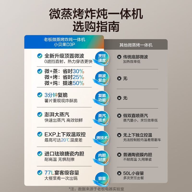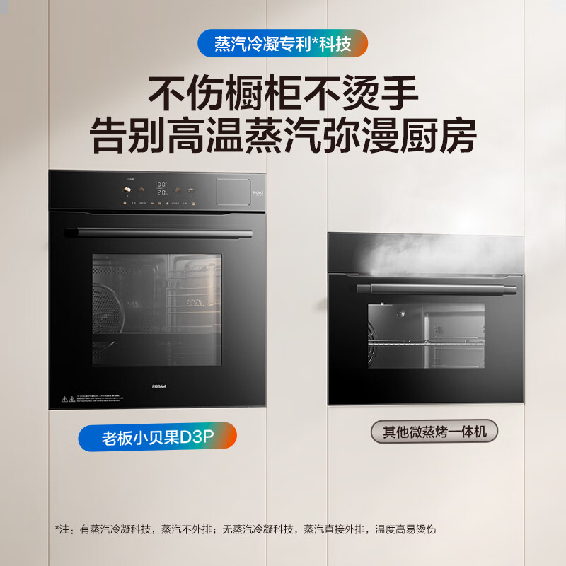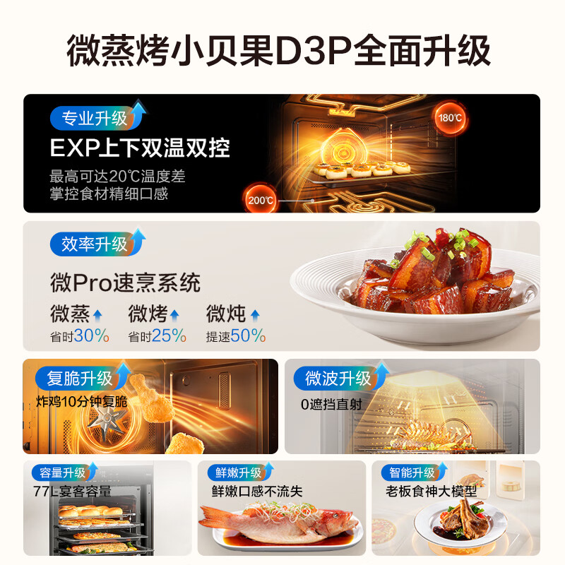 老板(Robam)77L微pro速烹小贝果D3P旗舰新款,作为厨房必备的多功能烹饪神器,这款设备集蒸、烤、炸于一身。不仅有升级版的EXP双温双控技术,还能通过精准调控温度与时间来满足不同的美食需求。