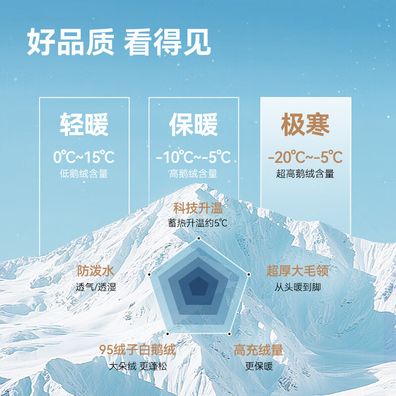 - 超高填充物质量:高品质进口极寒95鹅绒,保证温暖且轻盈。