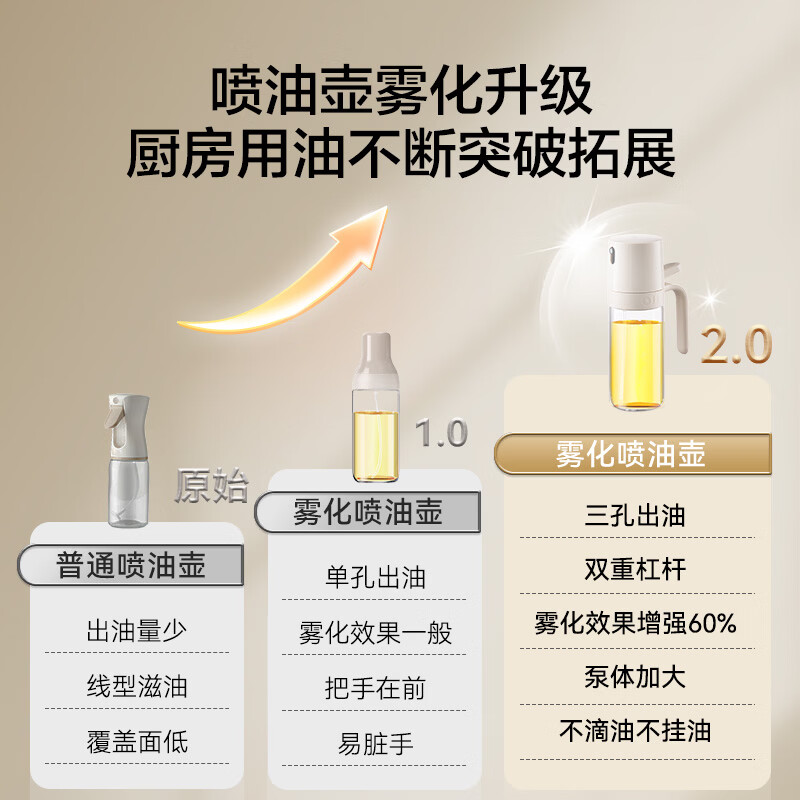 京东京造 喷油壶,是一款专为家庭烹饪设计的实用工具。它采用优质玻璃材质,不仅耐高温、易清洗,还具有出色的雾化效果,让调料和食用油均匀撒布在食物表面。