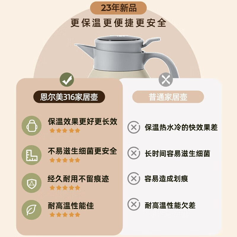 这款恩尔美保温壶以精致的外形和卓越的性能著称,采用优质的316不锈钢内胆,确保水温和水质纯净无异味。特别添加了智能显示温度功能,轻松掌握每一刻的温度变化。