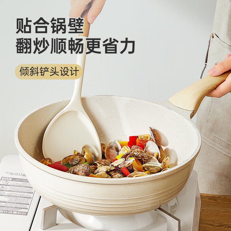 炊大皇这款硅胶铲勺套装非常适合现代家庭的烹饪需求。它包括四款实用工具:木柄不粘锅炒锅专用铲、煎锅平底锅专用铲、漏食品夹和一款多功能的餐勺。