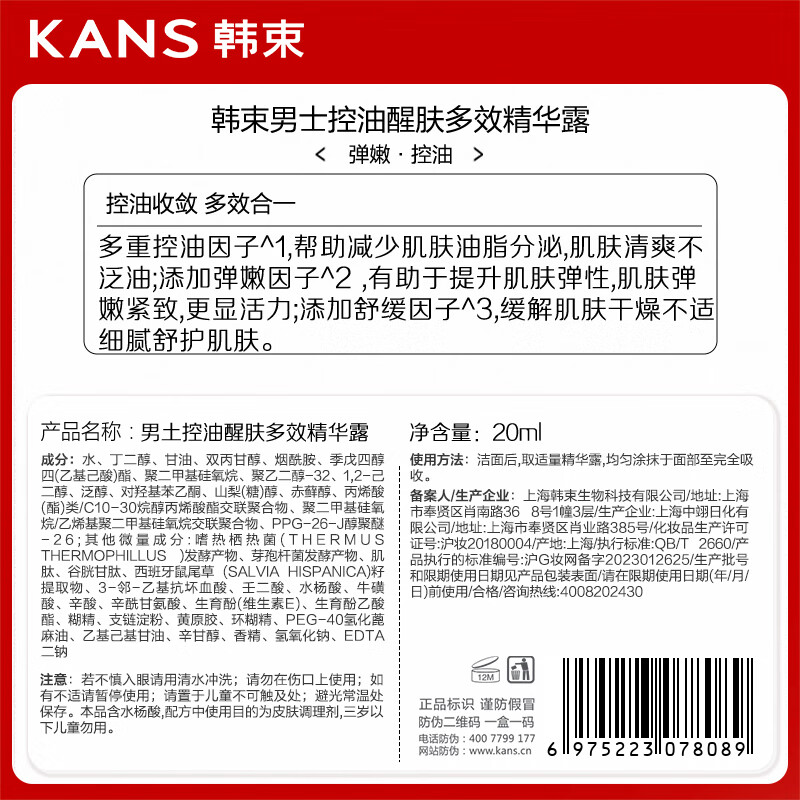 产品名称: 韩束男士控油多效精华露护肤品补水保湿收缩毛孔男生生日实用礼物20ml