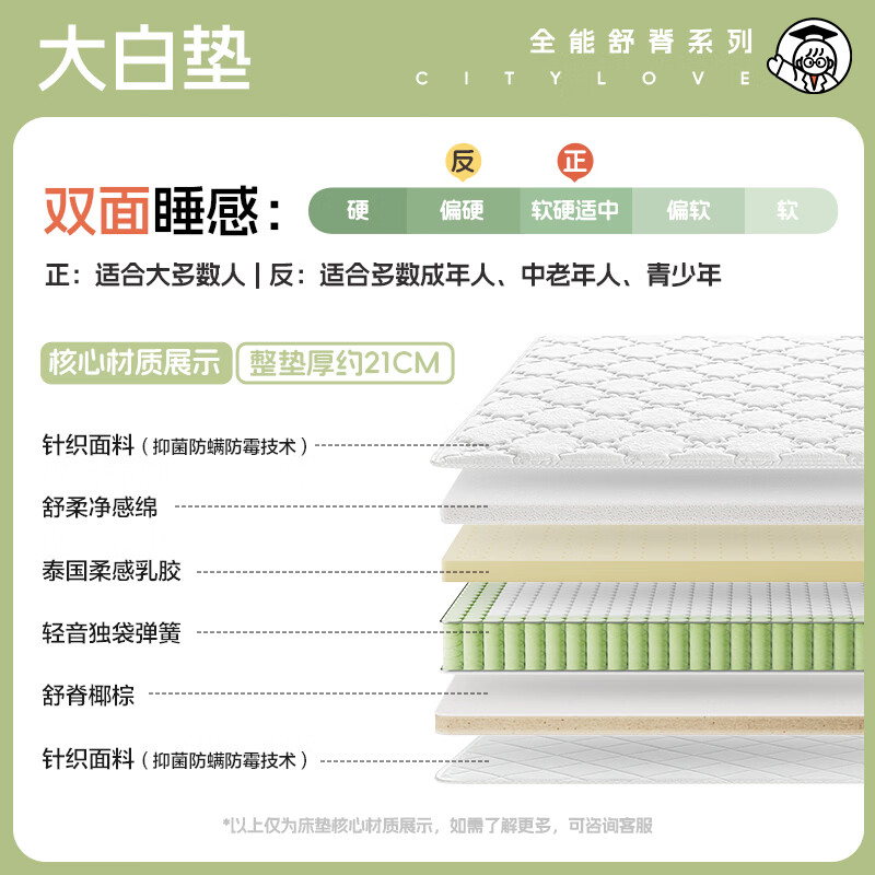 城市爱情喜临门床垫子乳胶独袋弹簧床垫双面席梦思 大白 1.2×2米 软硬双面