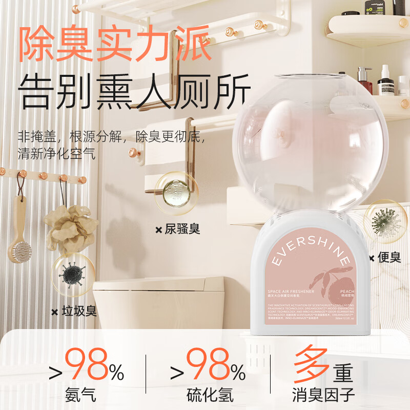 EVERSHINE 晴天大白倒立香氛是一款专为居家环境设计的空气清新剂,容量高达350ml。这款除臭喷雾不仅能有效清除卫生间、卧室等空间内的异味,还能带来持久清新的香气。