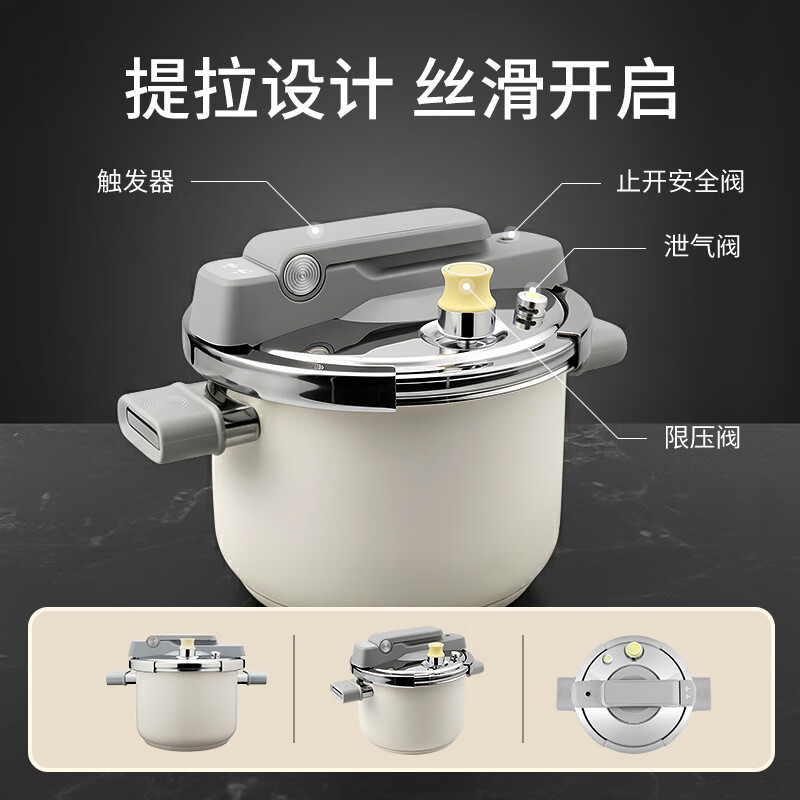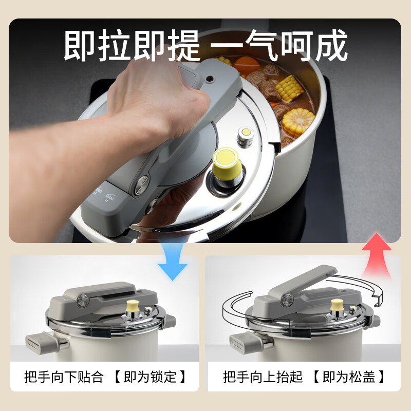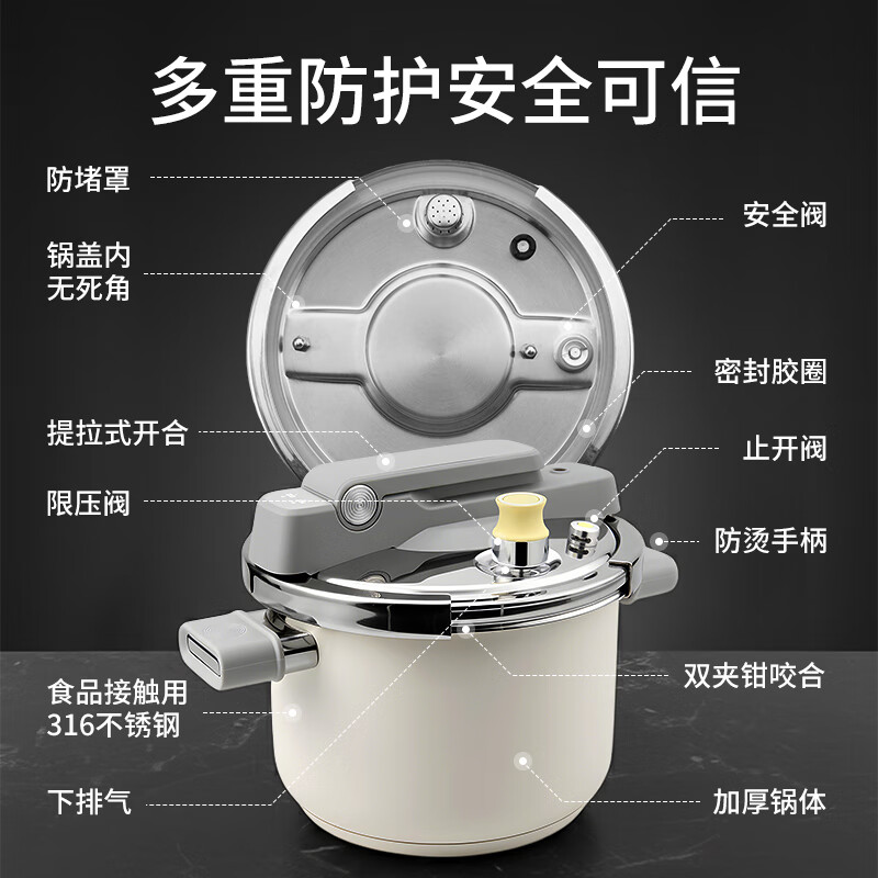 这款压力锅具有多重防爆功能,确保在各种环境下都能安心使用。同时它还兼容多种烹饪设备,无论是燃气灶还是电磁炉,都可以完美适配。其耐用的材质和强大的功能使其成为厨房里的理想选择。