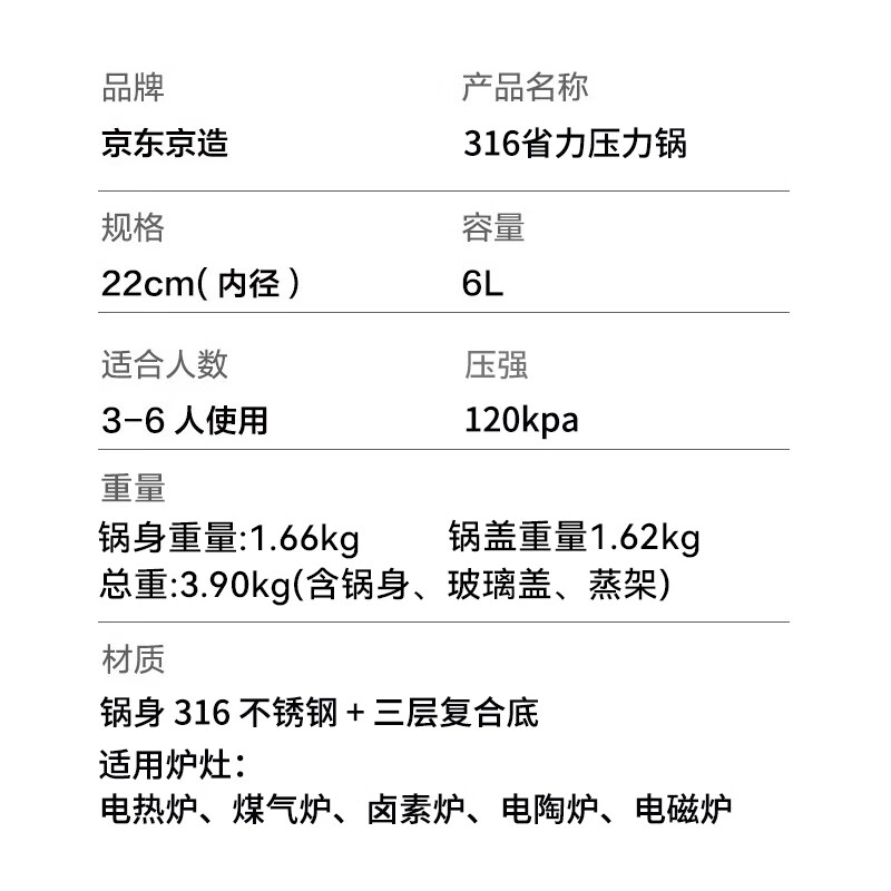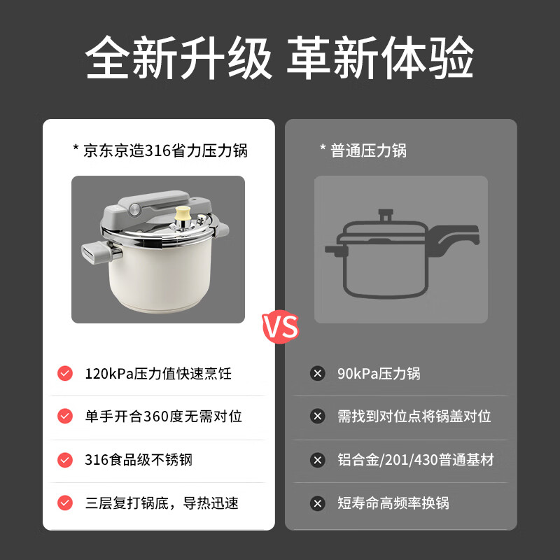 京东京造全新推出的这款316不锈钢高压锅是厨房必备神器。采用加厚设计,保证烹饪安全的同时,带来更快的煮食速度。其大容量设计(6L)适合家庭使用,无论炖肉、煲汤还是快速烹调都游刃有余。