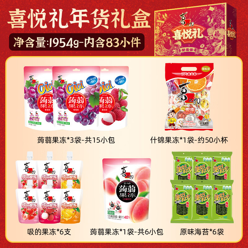 喜之郎为大家带来了一款充满节日气息的年货礼物——“喜悦礼”,这款年货大礼包不仅包含了经典果冻和海苔零食,总重量达到了惊人的1954克!无论是自用还是送礼都是极好的选择。