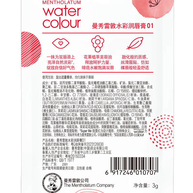 曼秀雷敦(Mentholatum)水彩有色润唇膏女生素颜补水保湿滋润淡唇纹防干裂 01我要红3g