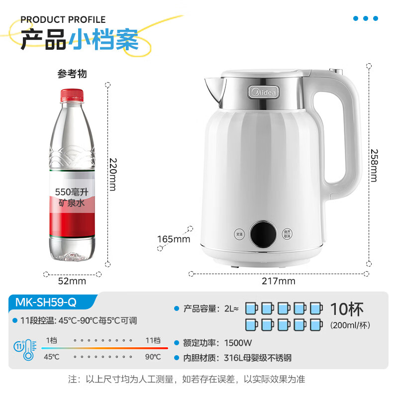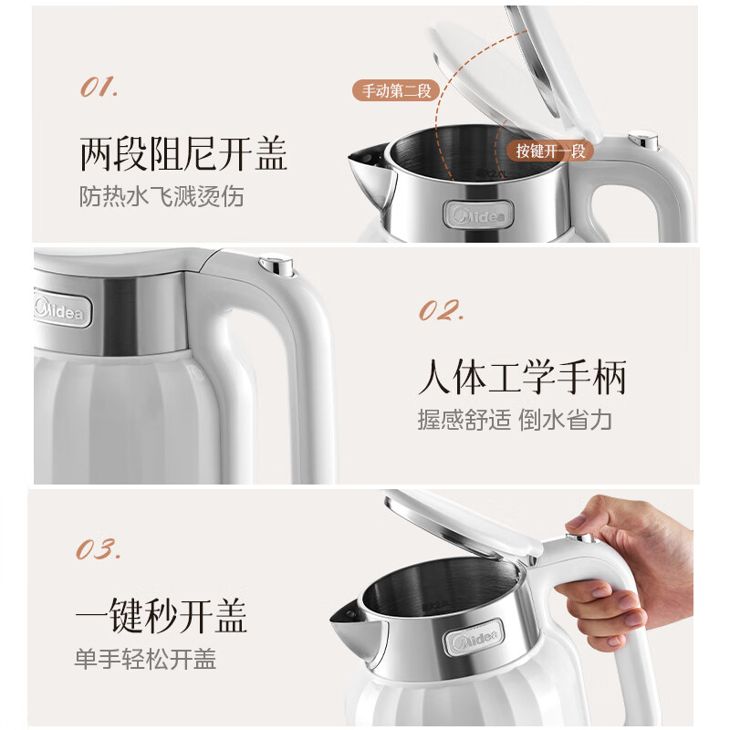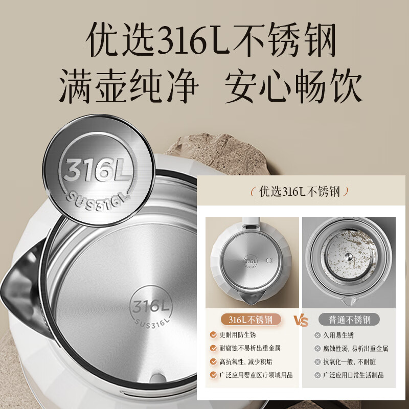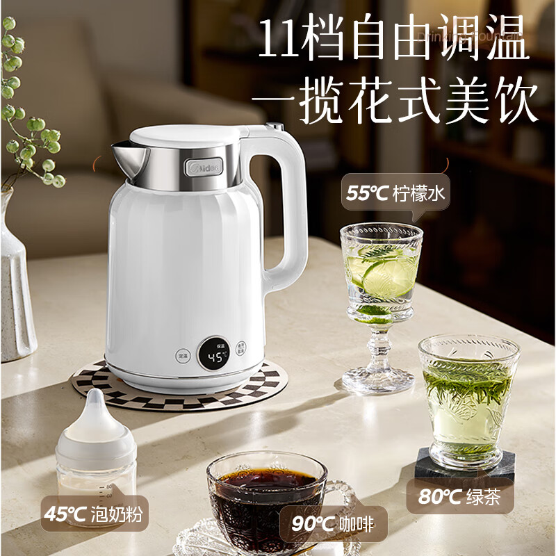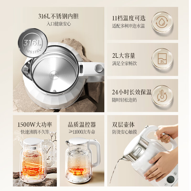 美的艺术家电热水壶 316L不锈钢电水壶,养生自动断电大容量恒温壶,11档智能控温。这是一款集设计美学与实用功能于一身的高品质电水壶。采用国际认证的316L食品级不锈钢内胆,健康安全;拥有2L的大容量,并且具备无缝焊接技术,清洁更方便。