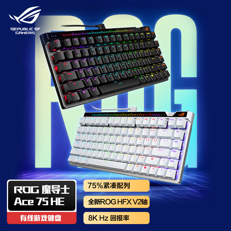 ROG魔导士Ace 75HE是一款专为电竞玩家打造的游戏键盘。它搭载了HFX V2磁轴RT0.01技术,提供流畅而精确的按键体验,并且六层消音结构确保在激烈的战斗中不会被键盘声音干扰。这不仅是一款装备,更是你胜利道路上不可或缺的好伙伴。