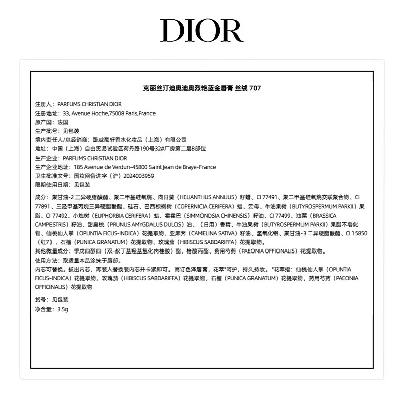 迪奥Dior烈艳蓝金口红丝绒707哑光3.5g唇膏,官方自营正品!这款丝绒质感的唇膏不仅拥有迷人的色彩,更具备持久保湿、滋润不干燥的特点。