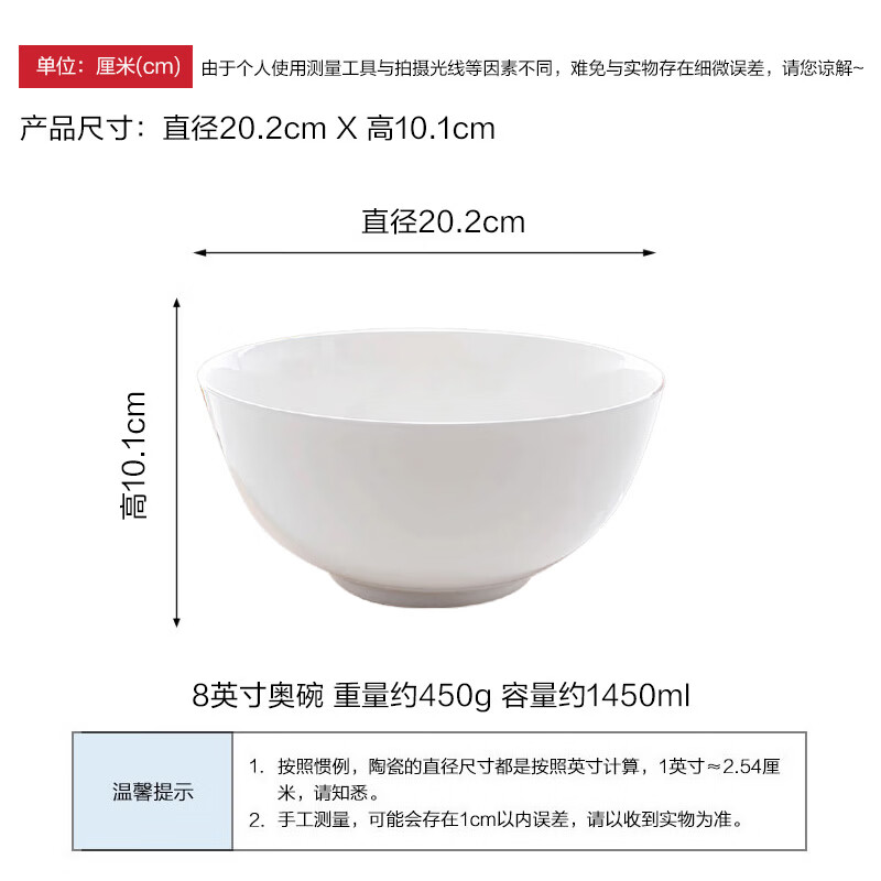 产品名称: 斯凯绨(Sky Top)汤碗陶瓷骨瓷大号汤盆纯白家用酒店餐具8英寸奥碗