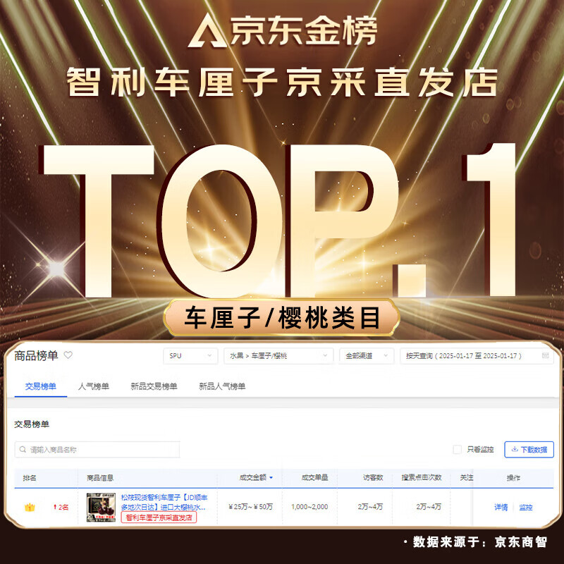 这款2.5kg净重的松筱智利进口原箱车厘子礼盒,在保留水果新鲜的同时,还为您提供了极为诱人的优惠。单果32-34mm的超级巨无霸4J级车厘子,每一颗都饱满多汁,口感绝佳。