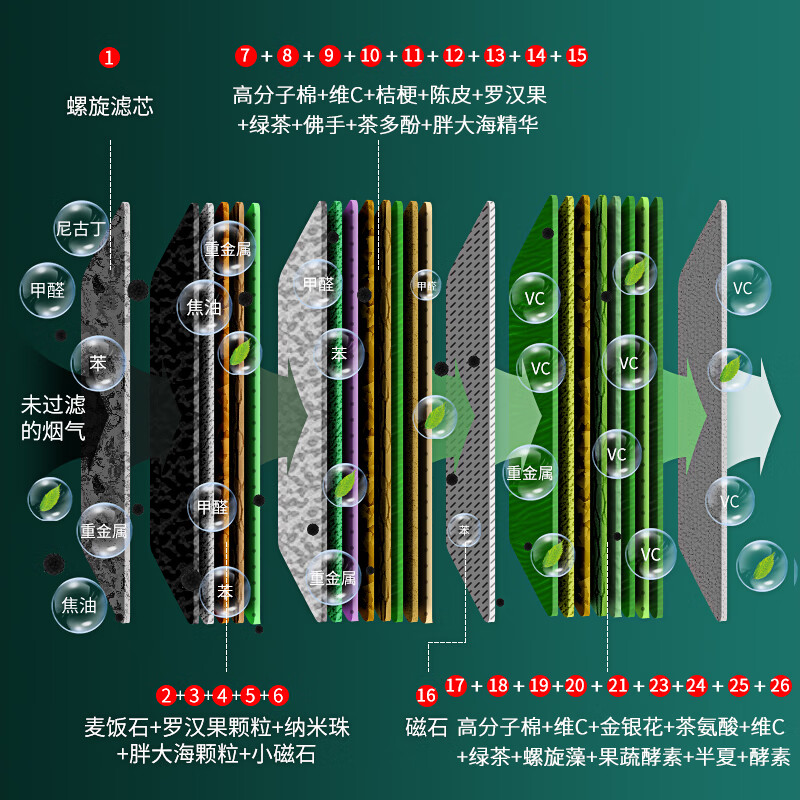 • 高效过滤:每根烟嘴拥有26层精密滤网,显著降低焦油和有害物质的吸入量。