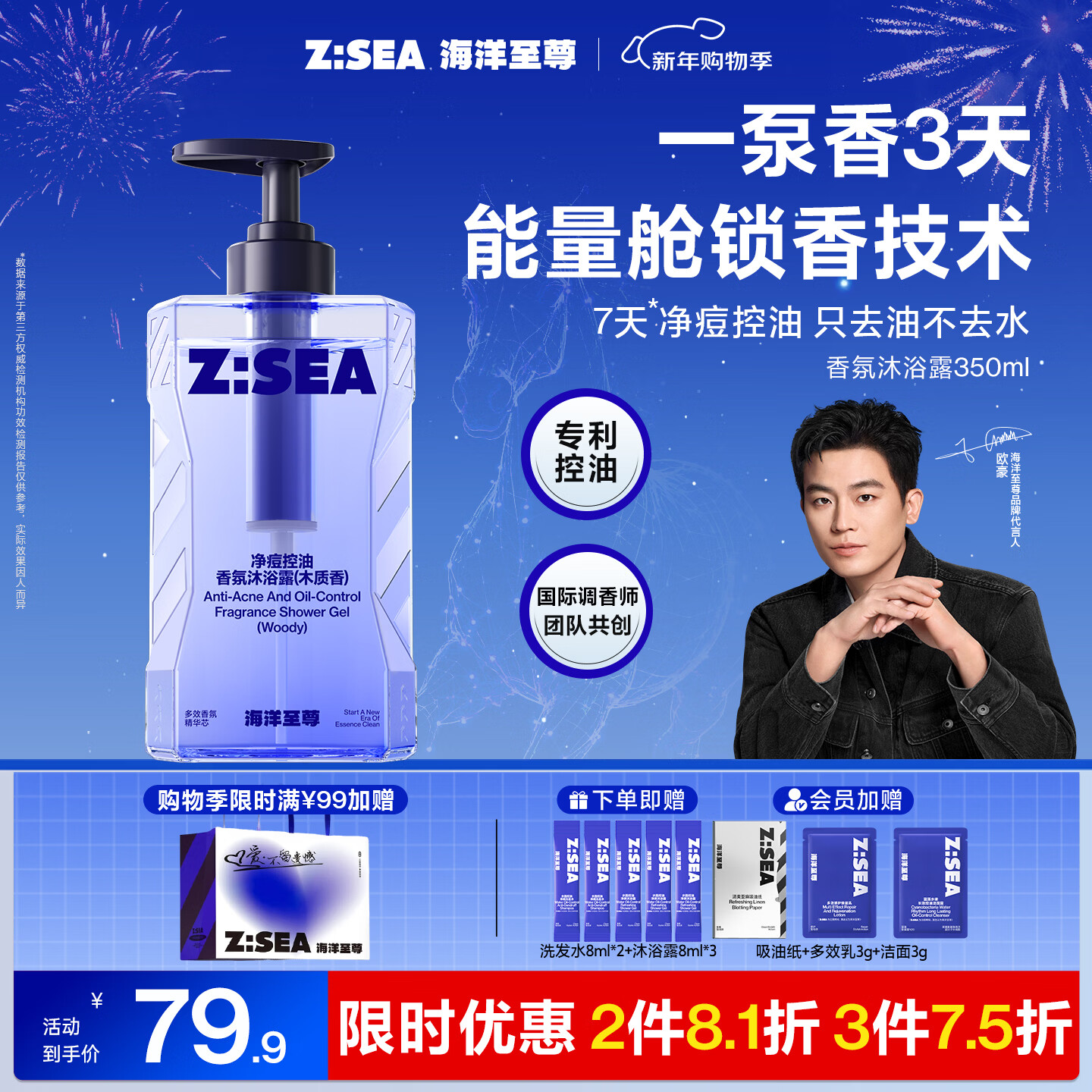 男士专用海洋至尊净痘控油沐浴露 350ml:72小时持久留香,净痘控油,保湿润肤