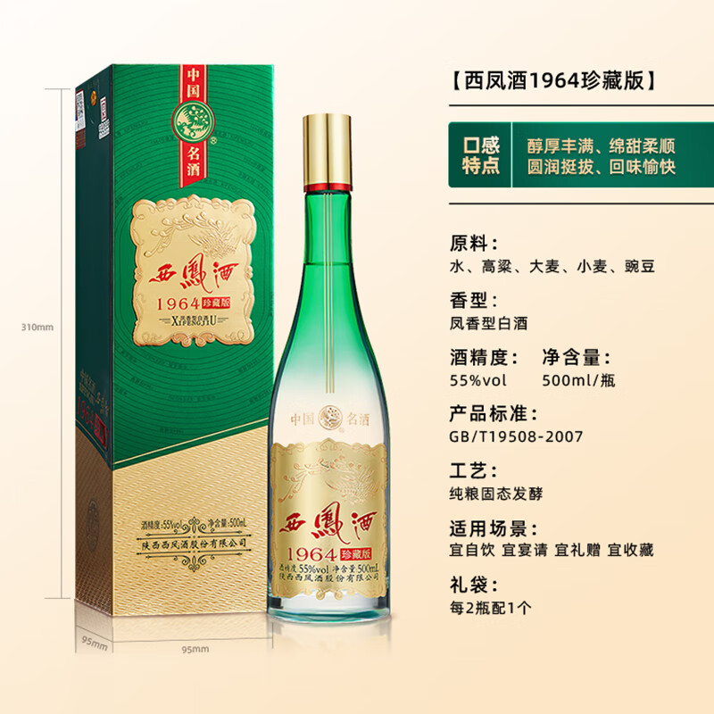 西凤酒以其独特的凤香型口感与悠久的历史享誉全国。这款55度的1964珍藏版纪念版更是其中佳作,精选优质原料、采用传统工艺精心酿制而成。