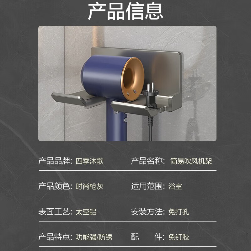 【产品名称】:四季沐歌吹风机置物架风筒浴室挂件枪灰卫生间免打孔吹风机收纳架。