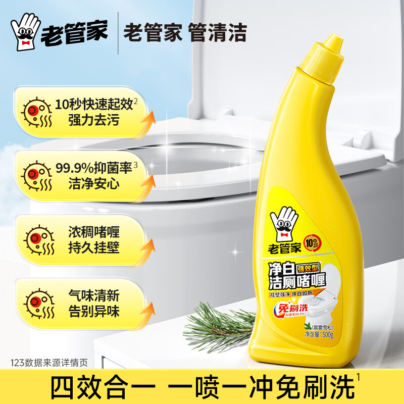 老管家净白洁厕啫喱500g*2装洁厕灵,专为马桶清洁设计。这款洁厕液能够有效除垢、去味并焕白,保证您家里的厕所时刻保持清爽宜人的环境。它不仅温和无刺激,还易于冲洗干净。