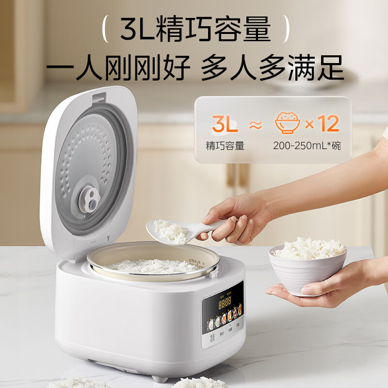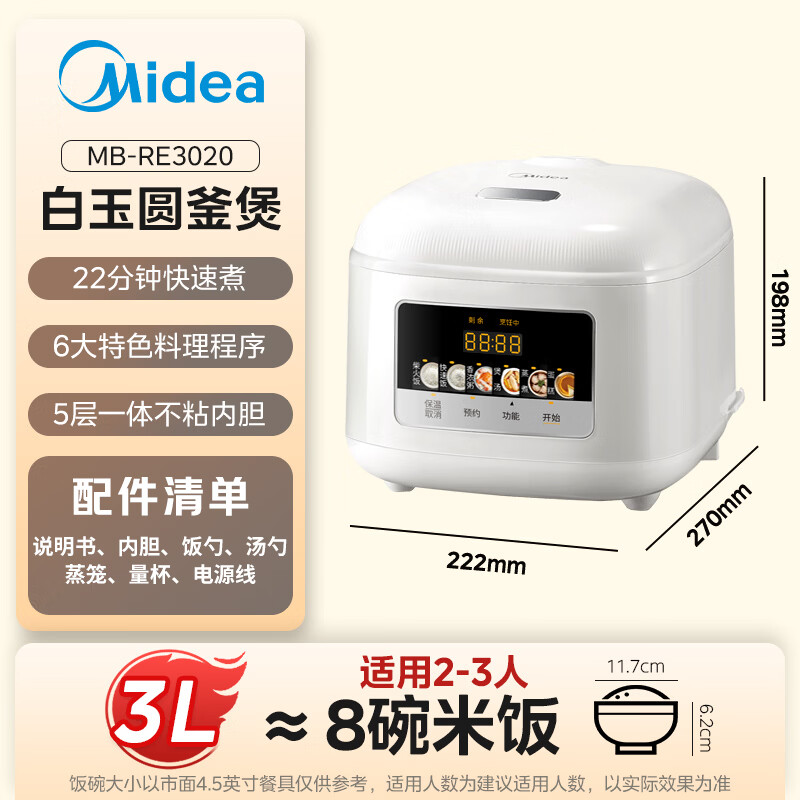 美的(Midea)电饭煲 3升白玉抗菌圆釜不沾锅,煮出美味健康家常米饭!