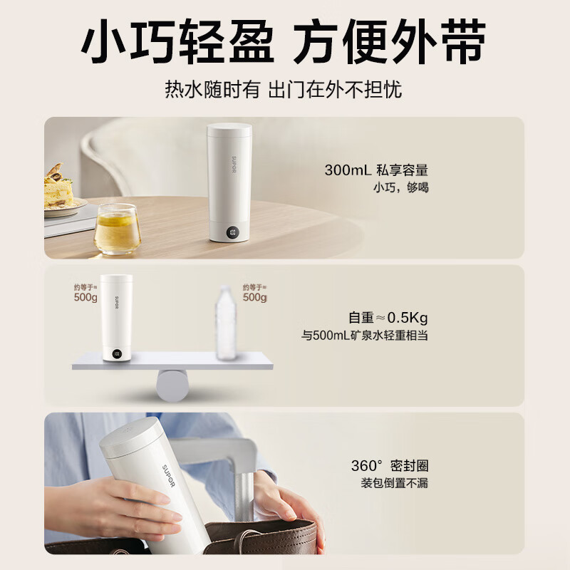 苏泊尔电热水杯是一款高品质便携式烧水壶,采用优质不锈钢材料,容量为0.3L,适合作为出差、旅行或办公室使用。它具备随行烧水功能,可以随时随地为您提供热饮。