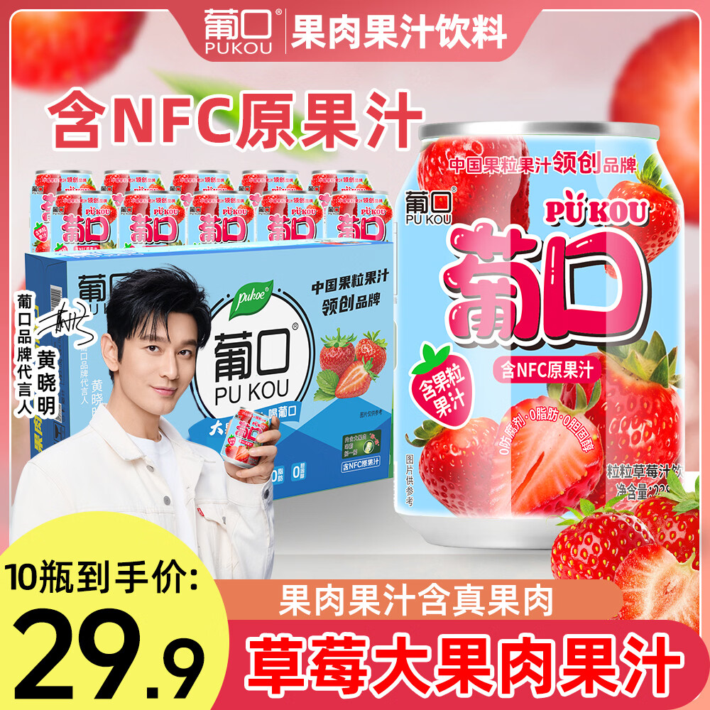 葡口(pukou)果肉含NFC原果汁饮料好喝新鲜优质水果粒聚餐游玩火锅烧烤大容量 草莓味果肉果汁238ml*10罐