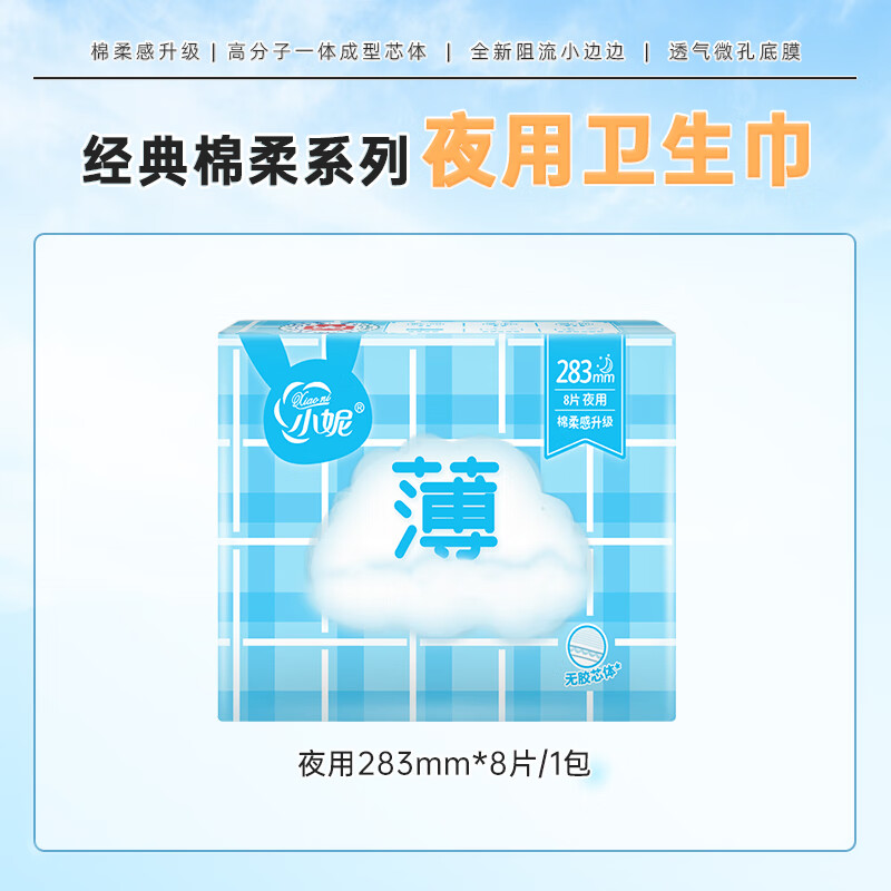 小妮卫生巾 经典棉柔干爽轻薄透气日用夜用,丝薄夜用 283mm 8片,让你体验全新的舒适感受。