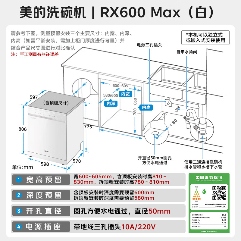 美的(Midea)【RX600Max白色】150L以上独嵌洗碗机全面升级105℃热风烘干+升降碗篮 一级水效 三星消毒分层洗,现在只需3528元!