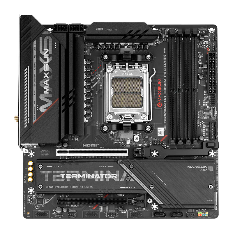 铭瑄 (MAXSUN) 终结者 B850M PRO DARK WIFI 主板是专为追求高性能和稳定性的用户设计的。这款主板支持最新的 AMD 锐龙处理器,包括 9850X3D、9700X、9600X 和 7800X3D 等型号,并且配备 DDR5 内存插槽以提升系统性能。