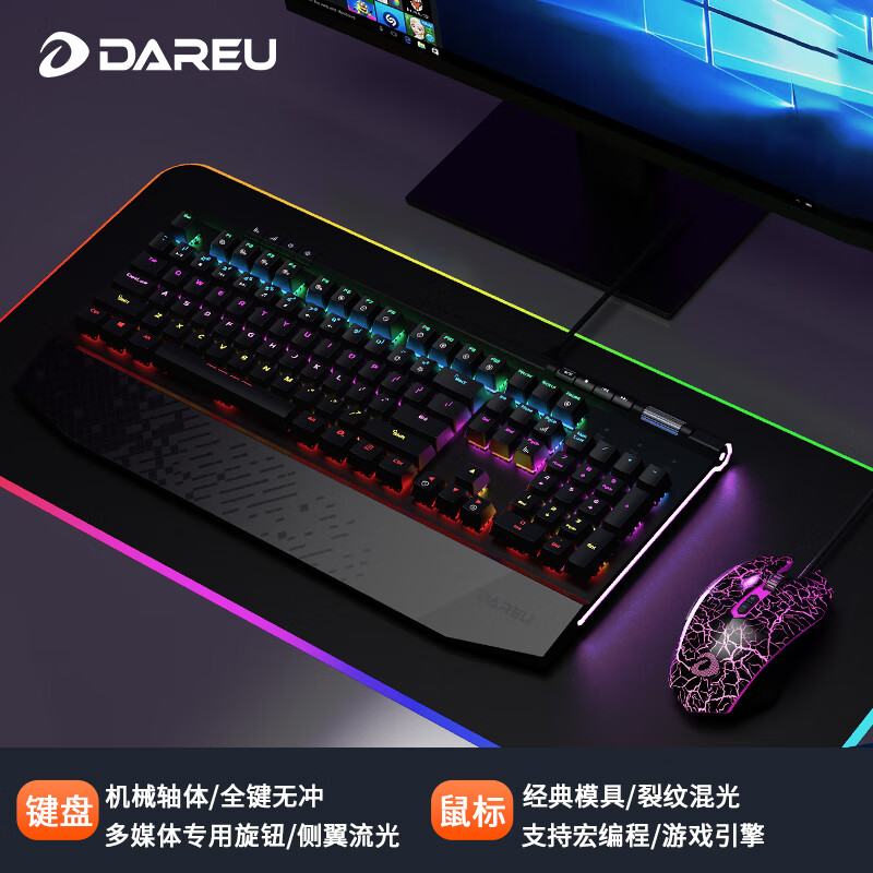 **达尔优 EK812 104键青轴电竞游戏键盘,搭配 EM915 二代裂纹黑鼠标,全尺寸设计,专为大手用户打造。无论是网咖环境还是家庭使用都表现卓越。