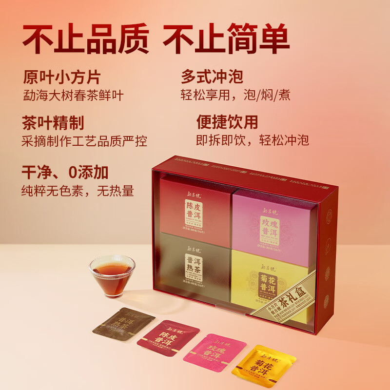 勐昌號茶叶云南普洱熟茶新会陈皮菊花玫瑰小方片茶叶礼盒,限量特惠中!现在只需 139.4元 ,原价为 186 元。这款勐昌号的精选普洱熟茶加入了珍贵的新会陈皮与清新的菊花和玫瑰花瓣,口感醇厚且香甜宜人。
