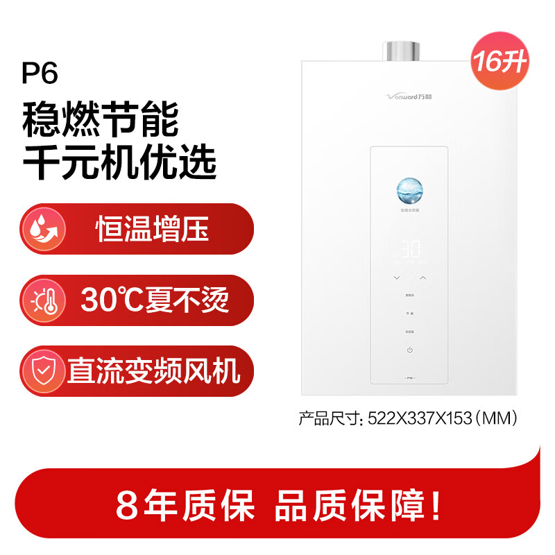 采用增压水伺服恒温技术的万和【白露P6 基础款】是一款16升天然气燃气热水器。这款产品结合了静音设计与节能特性,配备直流变频器以提升能效表现。