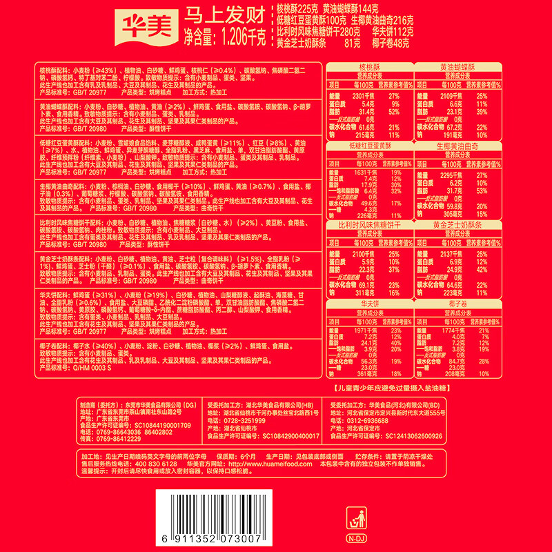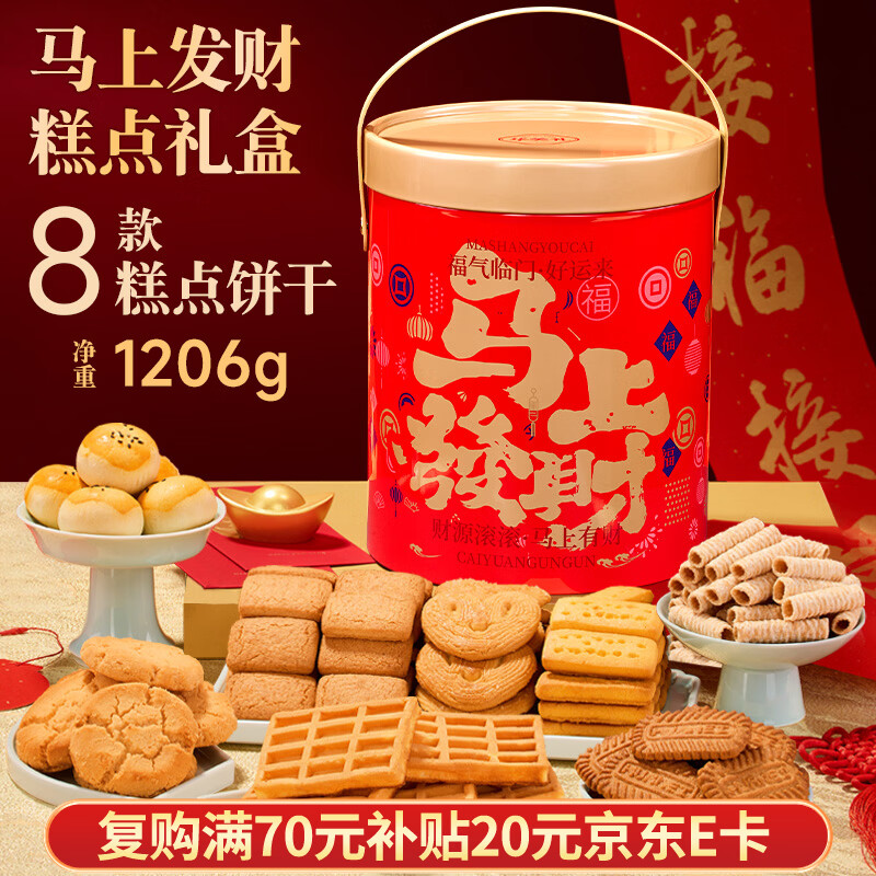 华美(Huamei)糕点年货礼盒曲奇饼干大礼包,包含多种口味和丰富份量的1206g,满足您的节日需求。产品采用优质原料制作,美味可口,无论是送礼还是家人共享都是绝佳选择。